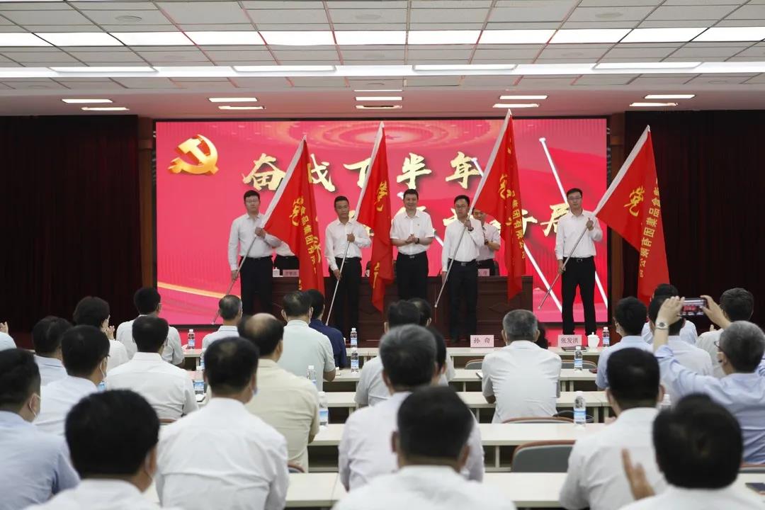 會(huì)議開(kāi)始,萬(wàn)守朋首先帶領(lǐng)全體參會(huì)黨員重溫入黨誓詞。會(huì)議通報(bào)了集團(tuán)黨史學(xué)習(xí)教育階段成果,部署了近期重點(diǎn)工作,表彰了集團(tuán)系統(tǒng)“兩優(yōu)一先”個(gè)人和集體,并啟動(dòng)“奮戰(zhàn)下半年,確保開(kāi)好局”活動(dòng)。集團(tuán)領(lǐng)導(dǎo)為獲獎(jiǎng)代表頒獎(jiǎng),為黨員突擊隊(duì)代表授旗。