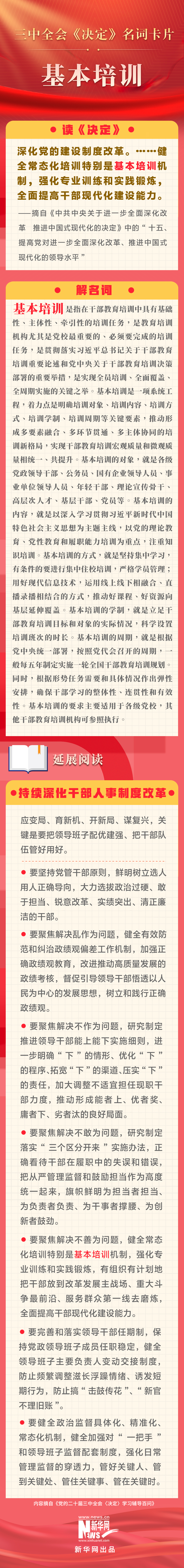 黨的二十屆三中全會審議通過了《中共中央關于進一步全面深化改革、推進中國式現代化的決定》。新華網依據《黨的二十屆三中全會〈決定〉學習輔導百問》,制作三中全會《決定》系列名詞卡片,和大家一起來深入學習領會二十屆三中全會精神。本期名詞是“基本培訓”。
