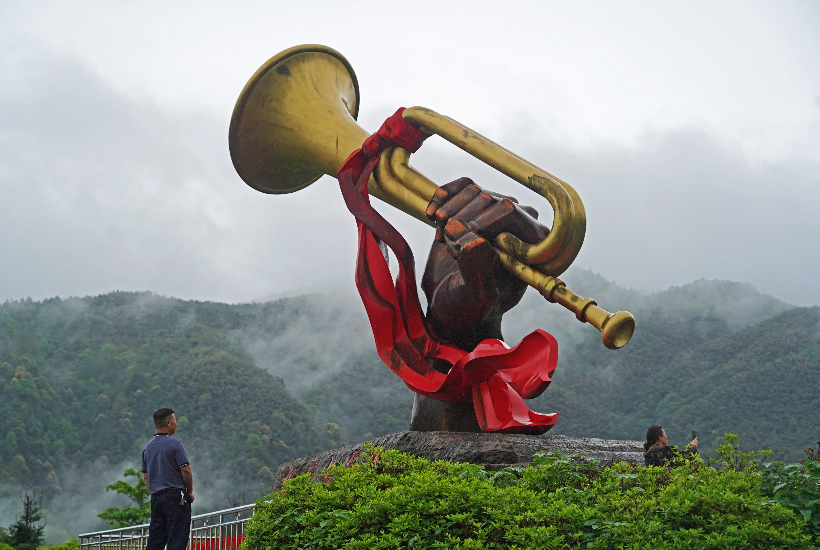 游客在井岡山參觀“勝利的號角”雕塑(2021年4月27日攝)。新華社記者 萬象 攝