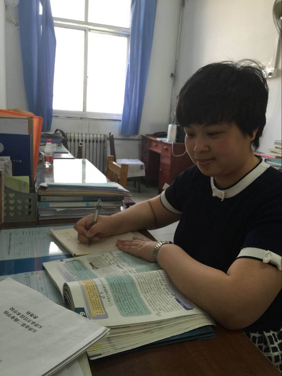 “欲影正者端其表,欲下廉者先其身”。作為一名基層黨支部書記,她深刻地體會到一名黨務(wù)工作者的一言一行在群眾眼中是何等重要;作為一名教師,她深知自己的一言一行又會對學生產(chǎn)生怎樣的影響。她曾說過:“我要對自己高標準,嚴要求,不干則已,干就干好”。支部工作中,她認真貫徹落實黨的路線方針政策和上級黨組織的決議決定,以日常教育教學工作促黨建,以提高隊伍素質(zhì)為重點,以強化管理為手段,抓好思想政治工作,加強自身的道德品質(zhì)修養(yǎng),努力發(fā)揮好共產(chǎn)黨員先鋒模范的作用。除了支部書記和教研室主任工作以外,她每周還承擔著20多節(jié)德育課的教學任務(wù),面對如此繁重的工作,她從不抱怨,更從不耽誤,均能按時按質(zhì)完成各項工作。她家住塘沽,每天上下班路途遙遠,但她從不搞特殊,嚴格按照學校各項規(guī)章制度辦事。