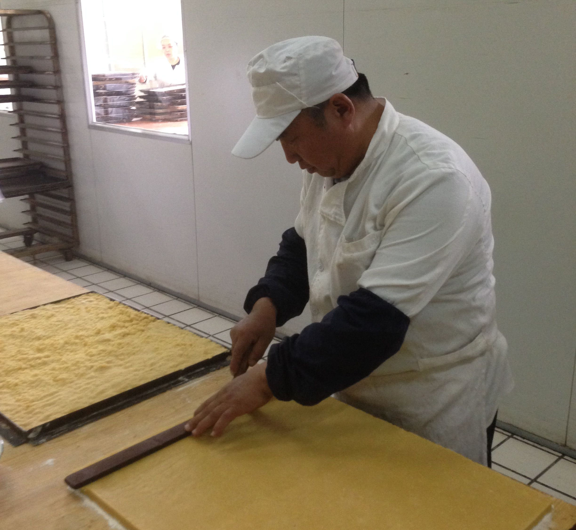 “蘇打餅干整個制作要花費6個多小時,其中醒面就占了將近4個多小時。這是一種清酥面的搟法,面皮和完以后裹上油之后再搟,所以要求面必須醒到位。另外需要注意的就是搟面的手法。搟制的過程中,面皮擱到桌面上要能清晰地看到面皮上的紋路,而且要均勻。”賈少春說起“蘇打餅干”的制作工藝如數(shù)家珍。