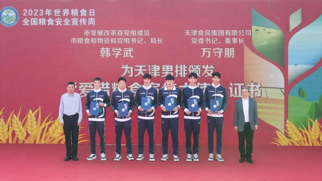 韓學(xué)武、萬守朋為天津食品集團男排頒發(fā)“愛惜糧食宣傳大使”證書。旨在進一步宣傳節(jié)約光榮、浪費可恥的思想觀念,倡導(dǎo)全民健身活動,倡導(dǎo)健康文明的新生活方式。