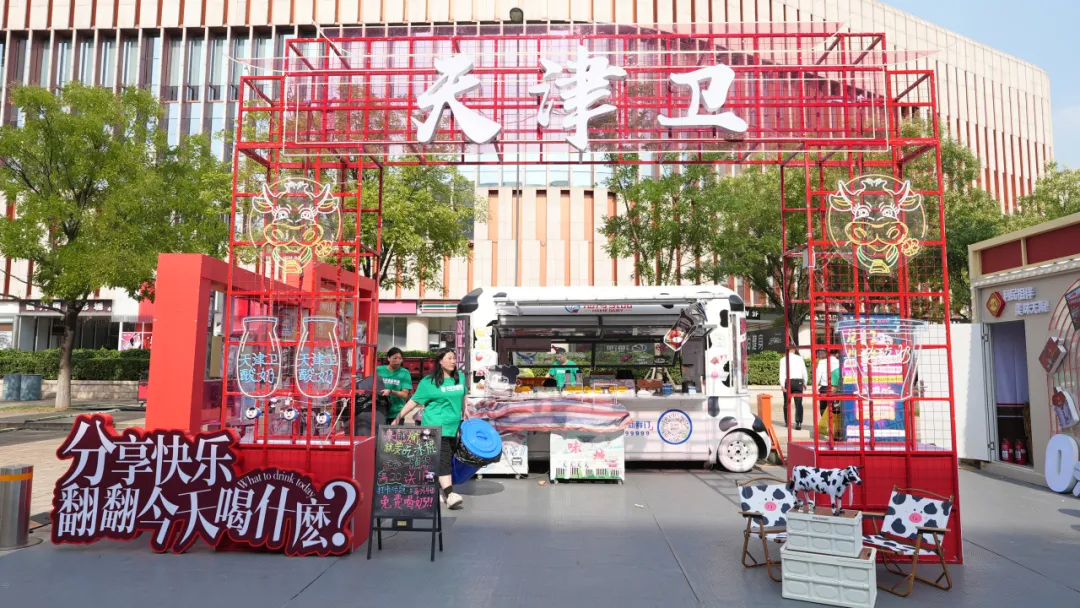 在展位設(shè)計(jì)上,結(jié)合天津地方特色,將中國(guó)紅與海河花色奶的“多姿多彩”相融合,創(chuàng)設(shè)“天津衛(wèi)”門頭吸引打卡拍照;搭建翻翻墻,市民可根據(jù)不同話題翻看不同產(chǎn)品,充滿趣味互動(dòng)性。售賣牛奶的牛奶巴士動(dòng)感十足,將牛奶花紋與“哪吒IP”形象相融合,可愛又富有活力。