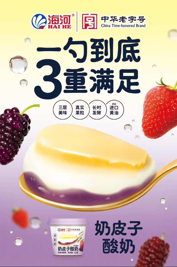 輕輕揭開杯蓋,來一場舌尖上的立體穿越。啟程于凝脂般金黃濃醇的奶皮子,特選進(jìn)口黃油在單杯慢發(fā)酵時光中凝萃的精華,每一口都是濃郁的脂香序曲。勺子如探險家般向下穿梭,觸達(dá)雪白柔滑的酸奶腹地,自然發(fā)酵的清新酸香溫柔承接。而旅程的高潮,在杯底熱烈綻放,大顆草莓與桑葚果粒浸潤在絳紫色果醬中,如同埋藏的味覺寶藏。一勺到底,不是簡單的分層品嘗,而是一次從濃郁奶脂、清新乳香到鮮活果粒爆漿的完整味覺敘事,金黃、雪白、絳紫在口中奏響出層次分明的交響曲。這杯酸奶,讓“吃”變成一場奇妙的感官旅程,直接開辟了“果粒奶皮子酸奶”這一全新細(xì)分賽道,海河乳品公司也成為該領(lǐng)域無可爭議的定義者與領(lǐng)跑者。