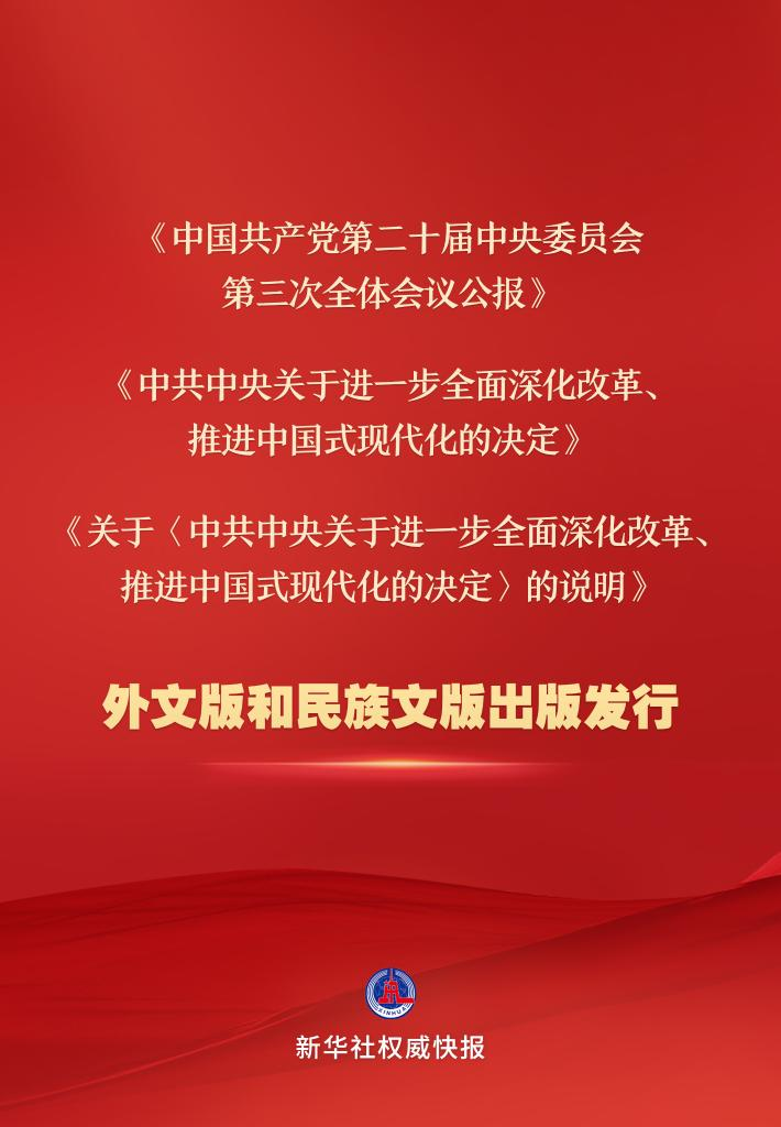 《中國共產(chǎn)黨第二十屆中央委員會第三次全體會議公報》《中共中央關(guān)于進一步全面深化改革、推進中國式現(xiàn)代化的決定》《關(guān)于<中共中央關(guān)于進一步全面深化改革、推進中國式現(xiàn)代化的決定>的說明》的英文、法文、西班牙文、日文、俄文、德文、阿拉伯文、葡萄牙文、越南文、老撾文等10種外文版已由中央編譯出版社、外文出版社出版,面向國內(nèi)外公開發(fā)行。